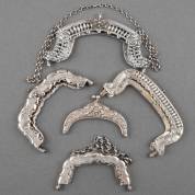 Vier 2e gehalte zilveren tasbeugels, diverse meesters en jaren, daarbij: 3e gehalte zilveren tasbeugel, gewicht 157 gram