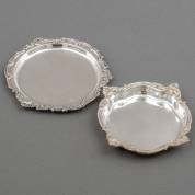 Twee diverse 2e gehalte zilveren flessenbakken met rocaillerand, beide meester: Hollandia Zilversmederij, Zutphen, 1939 en 1945, gewicht 203 gram, grootste Ø 13,5 cm