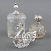 Kristallen parfumflacon met ruitslijpsel en 1e gehalte zilveren montuur en dop, daarbij kristallen zoutschaal in de vorm van een zwaan met 3e gehalte zilveren hals en vleugels, daarbij: kristallen dekselpot met 2e gehalte zilveren dop, dekselpot 16 cm -dop parfumflacon gedeukt-