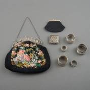 Geborduurde damestas aan 2e gehalte zilveren beugel met oud-Hollands decor, 1917, daarbij: enkele servetbanden en vingerdoekringen en een 2e gehalte zilveren pepermuntdoosje met filigrain en gegraveerde cartouche, brutogewicht 340 gram