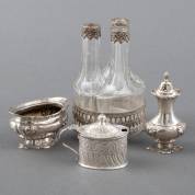 Menagèrestel in 2e gehalte zilveren houder op drie bolpootjes, de drie flesjes met zilveren montuur, zonder stopje, daarbij: 1e gehalte zilveren zoutschaaltje, strooier en mosterdpotje met blauw glazen binnenbakje, Sheffield en Birmingham, gewicht zilver 210 gram, menagèrestel 13,5 × 8,5 cm
