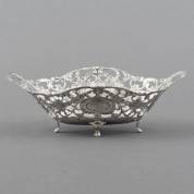 2e gehalte zilveren mandje met opengewerkt en gedreven voluut- en bloemdecor, gewicht 154 gram, 7,5 × 21,5 × 11,5 cm