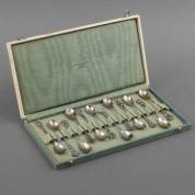 Twaalf 2e gehalte theelepels, de stelen uitlopend in verschillende soorten bloemen, in cassette, gewicht 119 gram, circa 11,5 cm