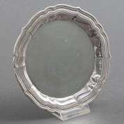 2e gehalte zilveren onderzetter / flessenbakje met gecontourneerde rand, gewicht 63 gram, binnendiameter 9,5 cm -deukje-