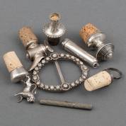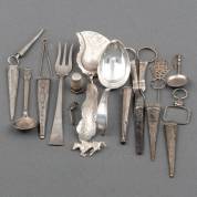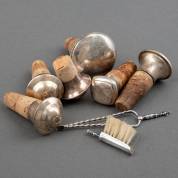 Zilveren miniatuur: stoffer, meester: Jan Breda, Amsterdam, 1718-1725, 5,5 cm -diverse haren missend-, en zilveren miniatuur: haardtang, meester: Arnoldus van Geffen, Amsterdam, 1768, 11,5 cm, daarbij: zes diverse zilveren flessenstoppen, diverse gehaltes -één ongekeurd, gebruikssporen-, brutogewicht totaal 182,2 gram