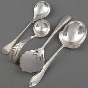 Divers 2e gehalte zilveren diengerei, bestaande uit: aardappeldienlepel, sauslepel, petit-fourschep en pasteischep, diverse meesters en jaren, gewicht 188 gram, pasteischep 20 cm