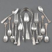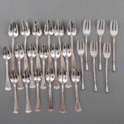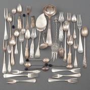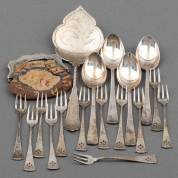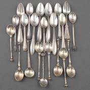 Diverse zilveren bestekdelen, theelepels en taartvorkjes, waaronder set van zes 2e gehalte zilveren taartvorkjes, Haags lof, gewicht zilver 543 gram