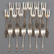 Twaalf 2e gehalte zilveren taartvorkjes met opengewerkte steel, en zes 2e gehalte zilveren mokkalepeltjes met bloem op de steel, gewicht 140 gram, vork 11,5 cm