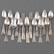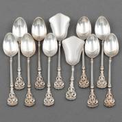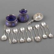 Elf 2e gehalte zilveren theelepels, theeduim en suikerschep met gravédecor, meester: Johannes van Halteren, Schoonhoven, 1895-1908, daarbij: twee 2e gehalte confiturevorkjes en theelepel met gravédecor, gewicht 142 gram -één lepeltje met herstelling-