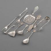 2e gehalte zilveren suikertang, twee 2e gehalte zilveren taartvorkjes, met getorste steel en ajourgezaagd decor, meester: Adrianus Kuijlenberg, Schoonhoven, set van vijf 2e gehalte zilveren mokkalepeltjes en theelepel met gegraveerd floraal decor en vijf 2e gehalte zilveren mokkalepeltjes met bloem op de steel, gewicht 122 gram