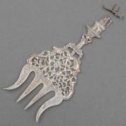 2e gehalte zilveren broodvork gedecoreerd met mascaron en bekroond met molen, gewicht 69 gram, 16,5 × 7,5 cm -wieken los, maar aanwezig-