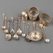 Divers zilverwerk, diverse gehaltes, bestaande uit diverse lepeltjes, theezeef, servetbanden en vingerdoekringen, gewicht 206 gram, grootste lepel 12,5 cm