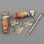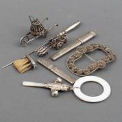 Zilverwerk, veelal 2e gehalte, bestaande uit: rammelaar met kunststof bijtring, gesp, drie miniaturen, twee naaldenkokers en tornnaald, brutogewicht 171 gram