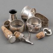 Divers 2e gehalte klein zilverwerk, bestaande uit: vier servetringen, vingerdoekring, drie flessenkurken en bakje met kunststof bodem, diverse meesters en jaren, brutogewicht 158 gram, bakje 4,5 cm -defecten-