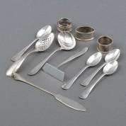 Divers klein zilverwerk, diverse gehaltes, bestaande uit: drie vingerdoekringen, kinderlepeltje, botermesje, olijvenlepeltje, kinderschuifje en vier theelepels, Hollands glad, gewicht 166 gram