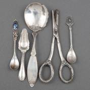 Divers 2e gehalte zilveren klein schepwerk, waaronder: suikerklontjestang, vleesvorkjes en mosterdlepeltje, gewicht 201 gram, suikerklontjestang 13 cm