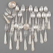 Set van twaalf 2e gehalte zilveren theelepels met uitlopende steel, set van zes 2e gehalte zilveren theelepels met getorste steel en parelrand, en zes 2e gehalte zilveren taartvorkjes met bokkenpootje, gewicht 202 gram, vorkjes 13 cm