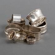 Verzameling zilveren servetringen / vingerdoekringen, veelal 2e gehalte, daarbij: twee onedele exemplaren, gewicht 187 gram -gegraveerd-