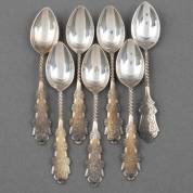 Set van zeven 2e gehalte zilveren kwast theelepels met getorste steel, gewicht 72 gram, 11 cm