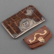 Twee lederen etuis, één met gegraveerde 14kt gouden appliques, de ander met 1e gehalte zilveren appliques en centraal decor van cherubijntjes, Birmingham, 1854, afmetingen laatstgenoemde 8 × 13 cm