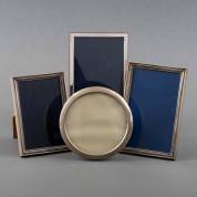 Drie rechthoekige zilveren fotolijstjes, waarvan één 1e gehalte, en twee 2e gehalte, daarbij: rond vermoedelijk 3e gehalte zilveren fotolijstje -keuren sleets-, grootste lijstje dagmaat 13,2 × 8 cm