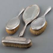 1e gehalte zilveren kapset met blad- en kruisdecor, bestaande uit: twee haarborstels, kledingborstel en handspiegel, meester: Wilhelm Binder, Swäbisch Gmünd, brutogewicht 561 gram, spiegel 25 cm -deukjes en scheurtjes langs randen-