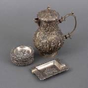 2e gehalte zilveren schenkkan, twaalf schoteltjes en een asbakje, alle met oud-Hollandse decors, gewicht 849 gram, kan 18 cm hoog