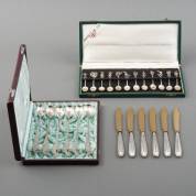 Twaalf 2e gehalte (900/1000) zilveren koffielepels in cassette, zes BWZG Djokja limonadelepels in cassette en zes fruitmesjes met 3e gehalte zilveren heften met parelrand in cassette, Duitsland, 19e/20e eeuw, gewicht zilver 160 gram, brutogewicht mesjes 139 gram