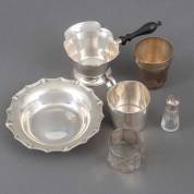 Divers zilverwerk, diverse gehaltes: schaaltje, twee bekertjes, servetring, zoutvaatje en sauskom met ebben greep, gewicht zilver minstens 300 gram, schaaltje Ø 15 cm -één bekertje met inscripties en deukjes, schaaltje met kleine deukjes-
