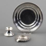 Rond gehamerd 2e gehalte zilveren schaaltje met inscriptie: 'Madelaine Marguerite van der Willigen 16-3-1939', meester: Bruckman & Söhne, Heilbron, jaren '30, daarbij: 2e gehalte zilveren tafelkandelaar met parelrand en BWZG Djokja asbakje, gewicht zilver 124 gram, brutogewicht kandelaar 50 gram, schaaltje Ø 16,5 cm -schaaltje met deuken, kandelaar met krassen in kaarsenhouder-