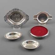 Divers 2e en 3e gehalte zilverwerk, bestaande uit: asbak met reliëfdecor van gebouw met inscriptie: '1 Jan 1879 -1 Jan 1929', glad asbakje, twee pastillebakjes en flessenonderzetter, gewicht zilver 215 gram, grote asbak 14 × 12 cm