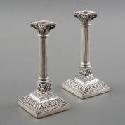 Paar 2e gehalte zilveren zuilvormige kandelaars op vierkante voet gedecoreerd met acanthusbladeren, losse bobèches, Hollands, 1913, brutogewicht 1228 gram, hoogte 20,5 cm -één kolom wat schuin-