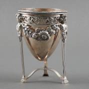 2e gehalte zilveren suikervaas, gedragen door drie zuilvormige bustes, waartussen guirlandes, de houder meesterteken: Rudolf Sondag, Rotterdam, 1791, de binnenbak (1816) en regels tussen de pootjes zijn van later datum, gewicht 398 gram, 13 × Ø 9,5 cm
