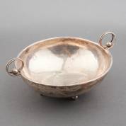 2e gehalte gehamerd schaaltje met twee oren op vier bolpootjes, meester: Gebr. Reggers, Amsterdam, 1929, essayeursteken W.C. Weier, gewicht 122 gram, 7 × 16 × Ø 13 cm -één pootje opnieuw aangezet, kleine restauratie in de rand-