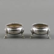 Paar 1e gehalte zilveren zoutschaaltjes met palmetdecor, op drie hoefpootjes, Londen, 1916, gewicht 179 gram, 4,5 × Ø 6,5 cm