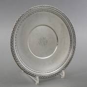 1e gehalte zilveren ronde schaal met gedecoreerde rand en monogram in het plat, meester: Mermod, Jaccard King, Verenigde Staten, gewicht 291 gram, Ø 25,5 cm