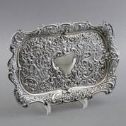 1e gehalte zilveren dienblad met rijk gedreven decor van voluten, bladeren en bloemen, en opengewerkte rand, Birmingham, 1897, gewicht 324 gram, 2,5 × 31 × 21 cm