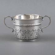1e gehalte zilveren kom met twee oren, en decor van acanthusbladeren, zogenoemde 'porringer', meester: Pairpoint Brothers, Londen, 1918, gewicht 219 gram, 8 × 17 × Ø 11cm