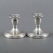 Paar 2e gehalte zilveren kandelaars op ronde voet, meesterteken onduidelijk, Hollands, 2002, brutogewicht 286 gram, 7 × Ø 7,5 cm