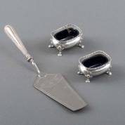 Paar 1e gehalte zilveren zoutschaaltjes met blauw glazen binnenbakjes, meester: Henry Clifford Davis, Birmingham, 1934, en taartschep met 3e gehalte zilveren greep afgezet met parelrand, Duitsland, 20e eeuw, brutogewicht zonder glas 122 gram, taartschep 24 cm -één binnenbakje gelijmd en losse schilfers-