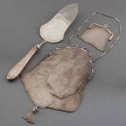 Divers zilverwerk: 2e gehalte zilveren beurs met groen en zwart email decor, 3e gehalte zilveren beursje, beide met onduidelijk meesterteken, en een 2e gehalte zilveren taartschep, meester: H. Schriek, Schoonhoven, 1935, in cassette, brutogewicht totaal 288 gram