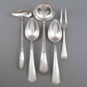 Vijfdelig 2e gehalte zilveren dubbelfilet dienbestek, bestaande uit: soeplepel, vleesvork, sauslepel, en twee aardappellepels, diverse meesters, eerste helft 20e eeuw, gewicht 614 gram