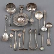 Divers klein schepwerk, voornamelijk 2e gehalte, waaronder: twee diverse kinderschuifjes, klontjestang, theezeef, en twee diverse roomlepels, gewicht 177 gram, klontjestang 10 cm