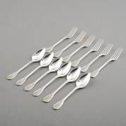 Zes 3e gehalte zilveren dessertcouverts, hartenfilet, verso met monogram 'C H', België, 19e eeuw, gewicht 450 gram, circa 17 cm