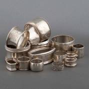 Verzameling 2e en 3e gehalte zilveren servetbanden en vingerdoekringen met inscripties, diverse meesters en jaren, gewicht 204 gram -defecten-
