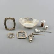 Divers zilverwerk, diverse gehaltes, waaronder: 2e gehalte zilveren bonbonmandje, flessenstop en fotolijst gemaakt van 2e gehalte zilveren beursbeugel, gewicht zilver minimaal 245 gram, daarbij: verzilverde flessenstop, bonbonmandje 5,5 × 15 × 11 cm