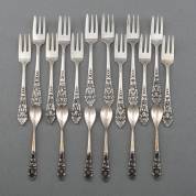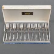 Twaalf 2e gehalte zilveren taartvorkjes, Haags lofje, meester: Koninklijke van Kempen en Begeer, Zeist, 1966, gewicht 200 gram, lengte 12,5 cm, in doosje