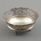 2e gehalte zilveren schaaltje met opengewerkte rand op drie pootjes, gewicht 229 gram, 8 × 15,5 cm