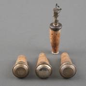 Drie ronde 2e gehalte zilveren wijnstoppers, en 2e gehalte zilveren wijstopper bekroond door molen, brutogewicht 55 gram, molen 11 cm -defecten, gedeukt-