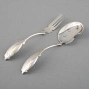 2e gehalte zilveren pasteiserveerset, met gegraveerde stelen, bestaande uit pasteischep en vork met snijkant, meesterteken onduidelijk, Nederland, 1873, gewicht 57 gram, 18,5 cm